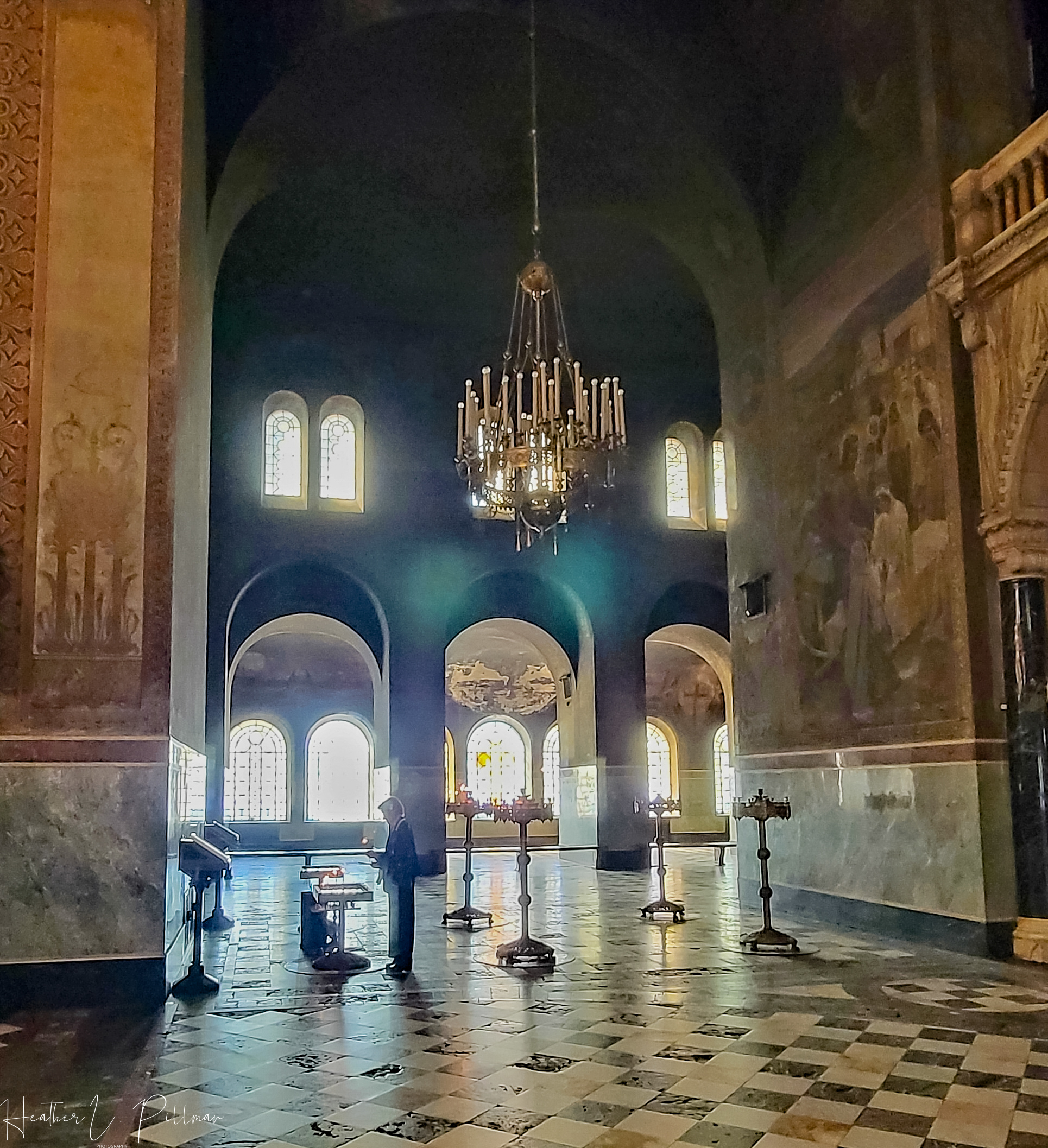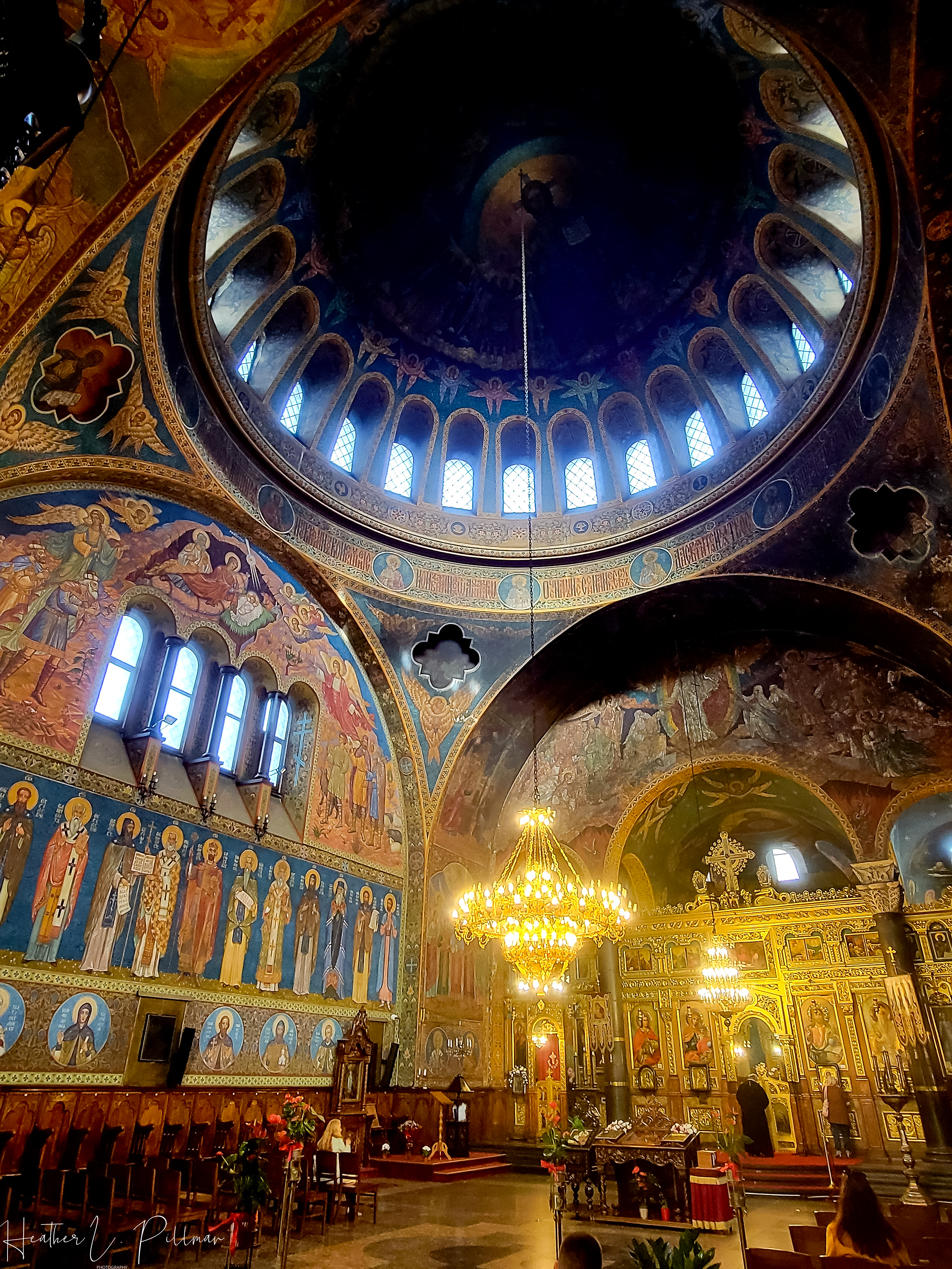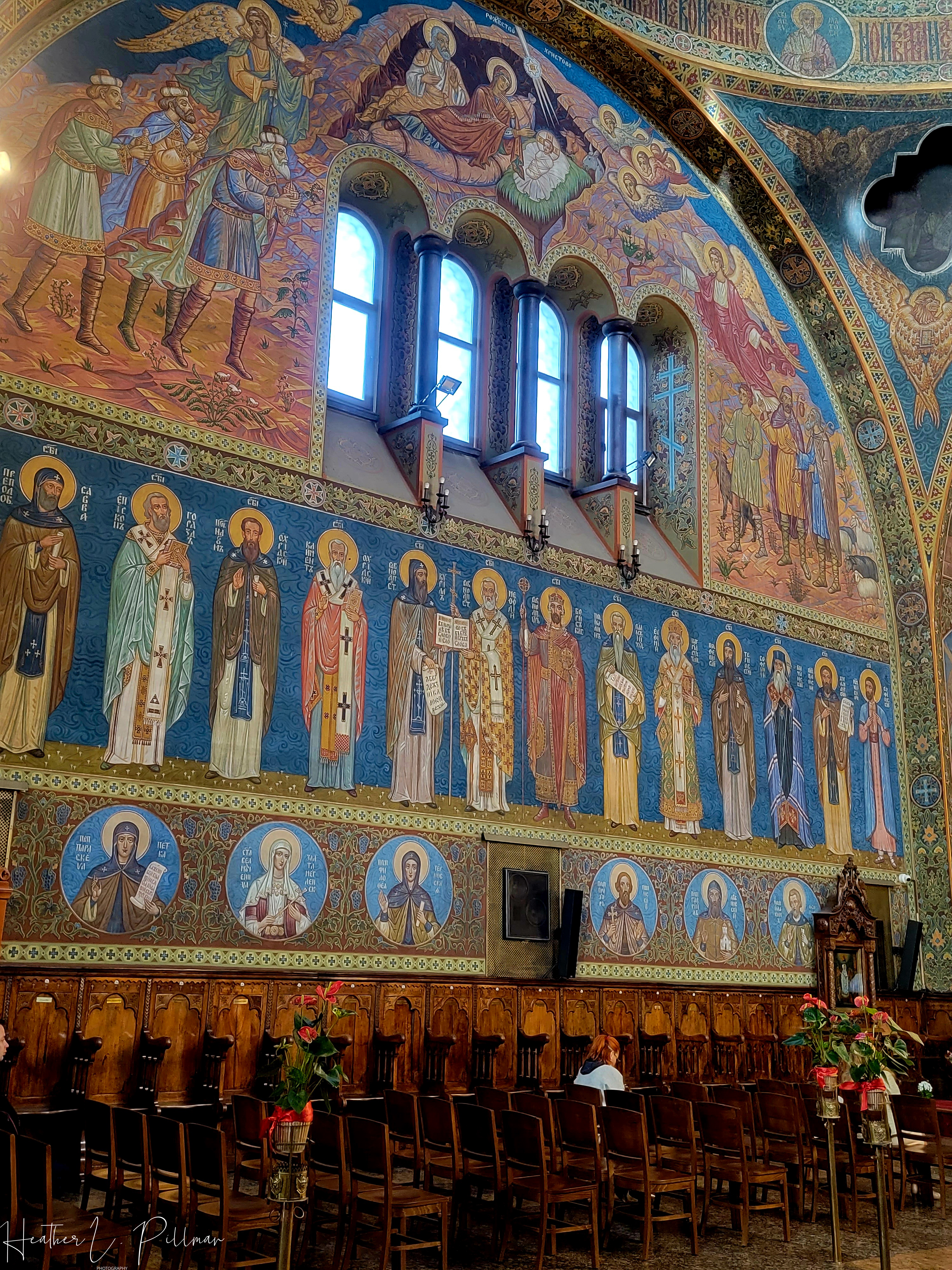 Orthodox services are more, what I’ll call, free flowing than other religious services I’ve witnessed. While there are similarities in some respects to the Catholic religion (making the sign of the cross, lighting of candles, the saints, etc.), there are also distinct differences. There are rarely any seats or pews in the Orthodox churches. Parishioners stand and/or kneel for the service. On occasion, you’ll see a few seats lining the outside of the sanctuary and those seats are intended for parishioners that need to sit. The altars are restricted to the priests, who are married by the way.