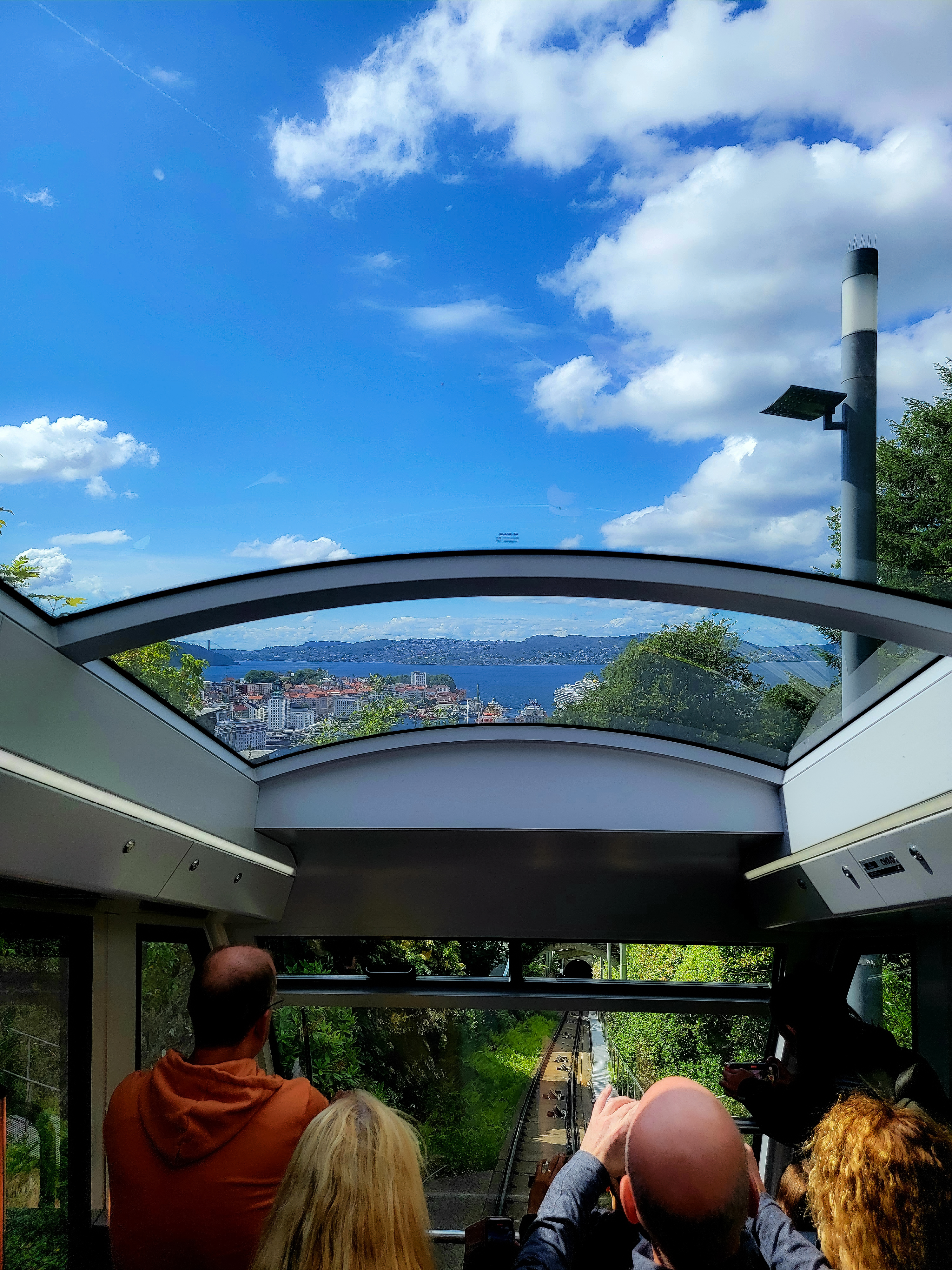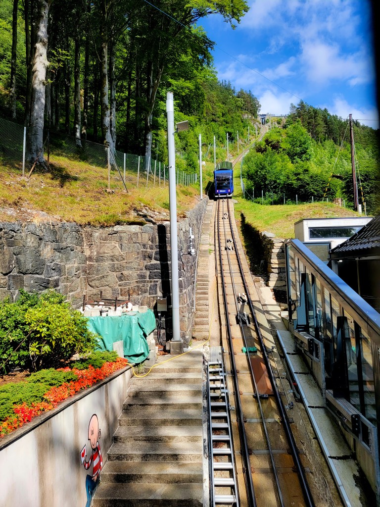 After checking into the hotel, our group took a little wander around town and made a stop at the meat market for lunch. I enjoyed a reindeer hot dog (delicious). We then ended up getting tickets for the Floibanen Funicular. The funicular runs 320 meters above sea level to Floyen. Views at the top are fantastic. You can book a round trip ticket or ride one way and then hike back down to Bergen (and you can get your tickets right at the funicular station).