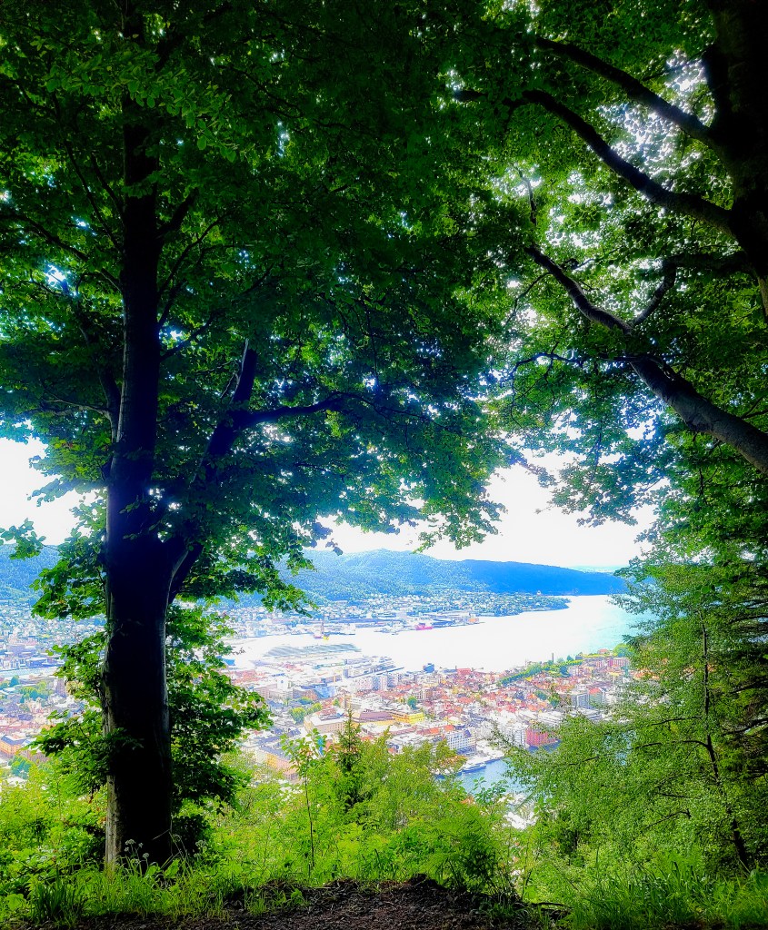 My friend and I both have lived in mountainous areas in the western United States and decided we could definitely hike down the trail back to Bergen. And we did. But….it took us a lot longer than anticipated. The trails wander and connect with other trails and we both wished we’d had on more appropriate footwear. We eventually made it down and we most definitely saw more of Bergen than we anticipated.